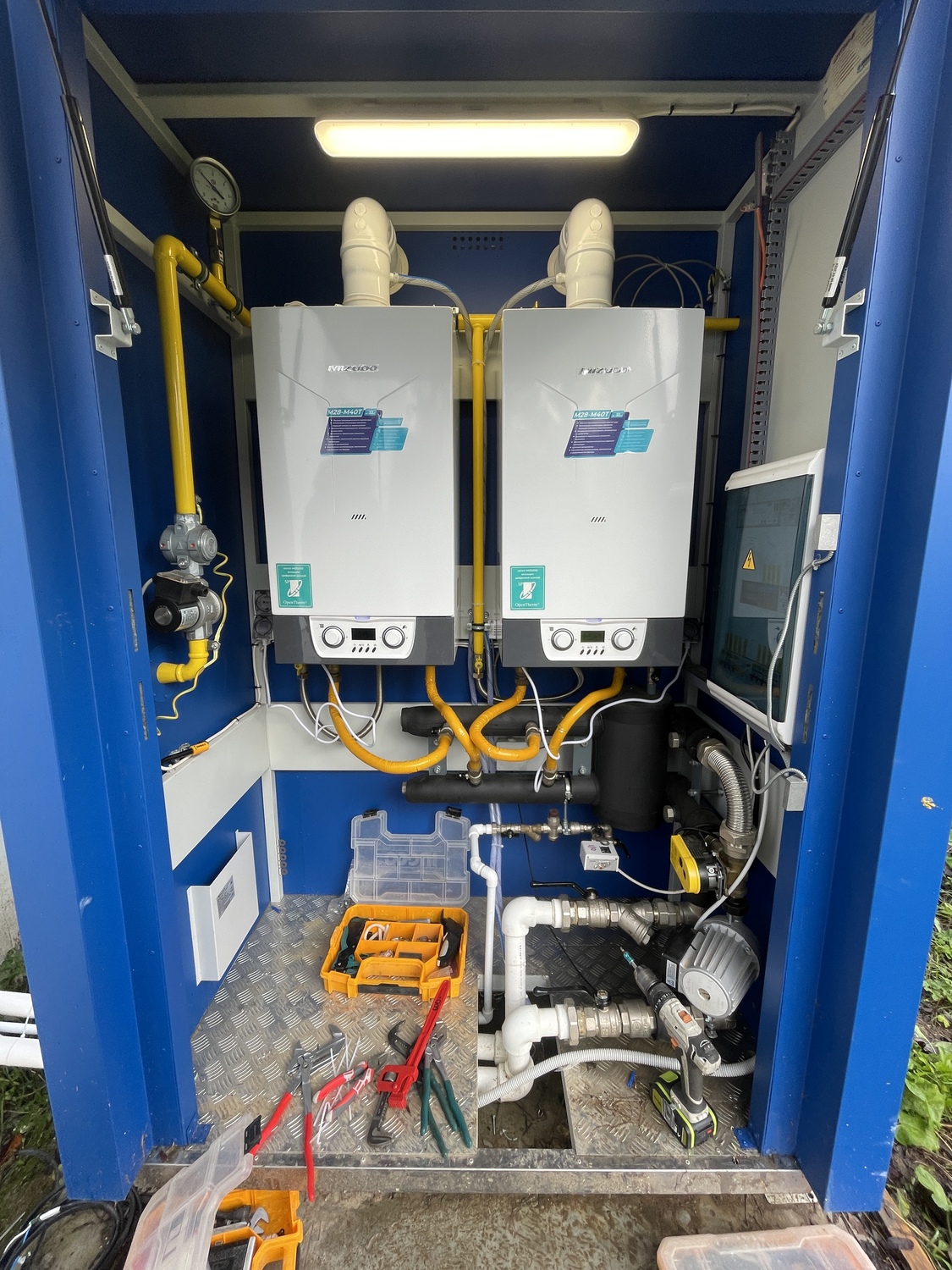 В составе решения установлен каскад из двух настенных котлов, продувочные свечи, система диспетчеризации, щит управления, утепленный корпус, коллекторная тепломеханическая группа и коаксиальные дымоходы.