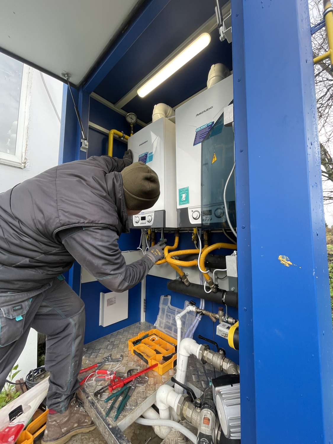 Монтаж уличного газового термоблока ТГУ-НОРД 60: установка, гидравлические испытания, заполнение системы, пуск и наладка оборудования.