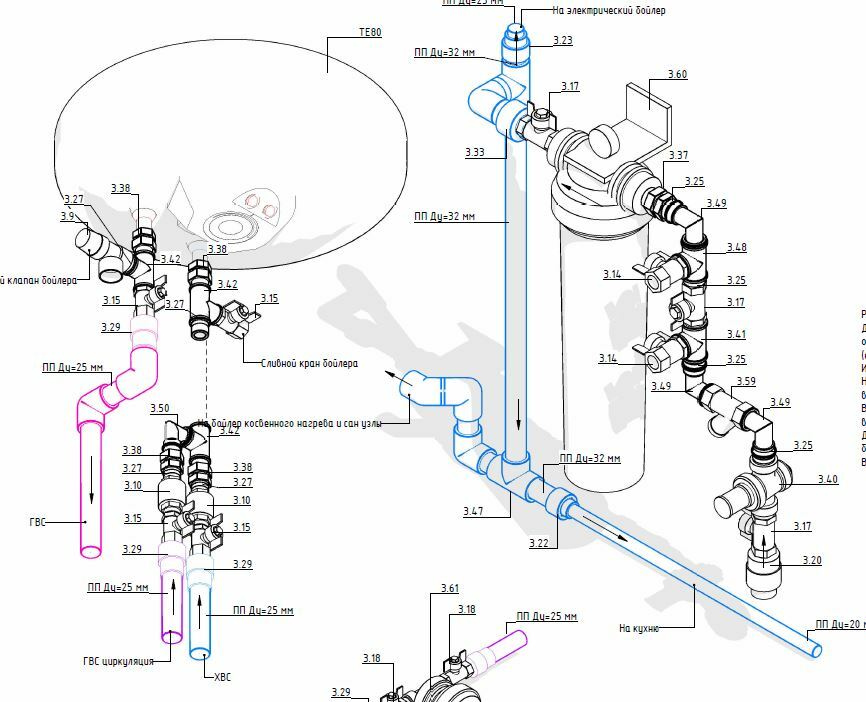 В проекте предусмотрены радиаторное отопление, система горячего и холодного водоснабжения, рециркуляция ГВС, внутренняя канализация, дымоходы и вентиляционные каналы.